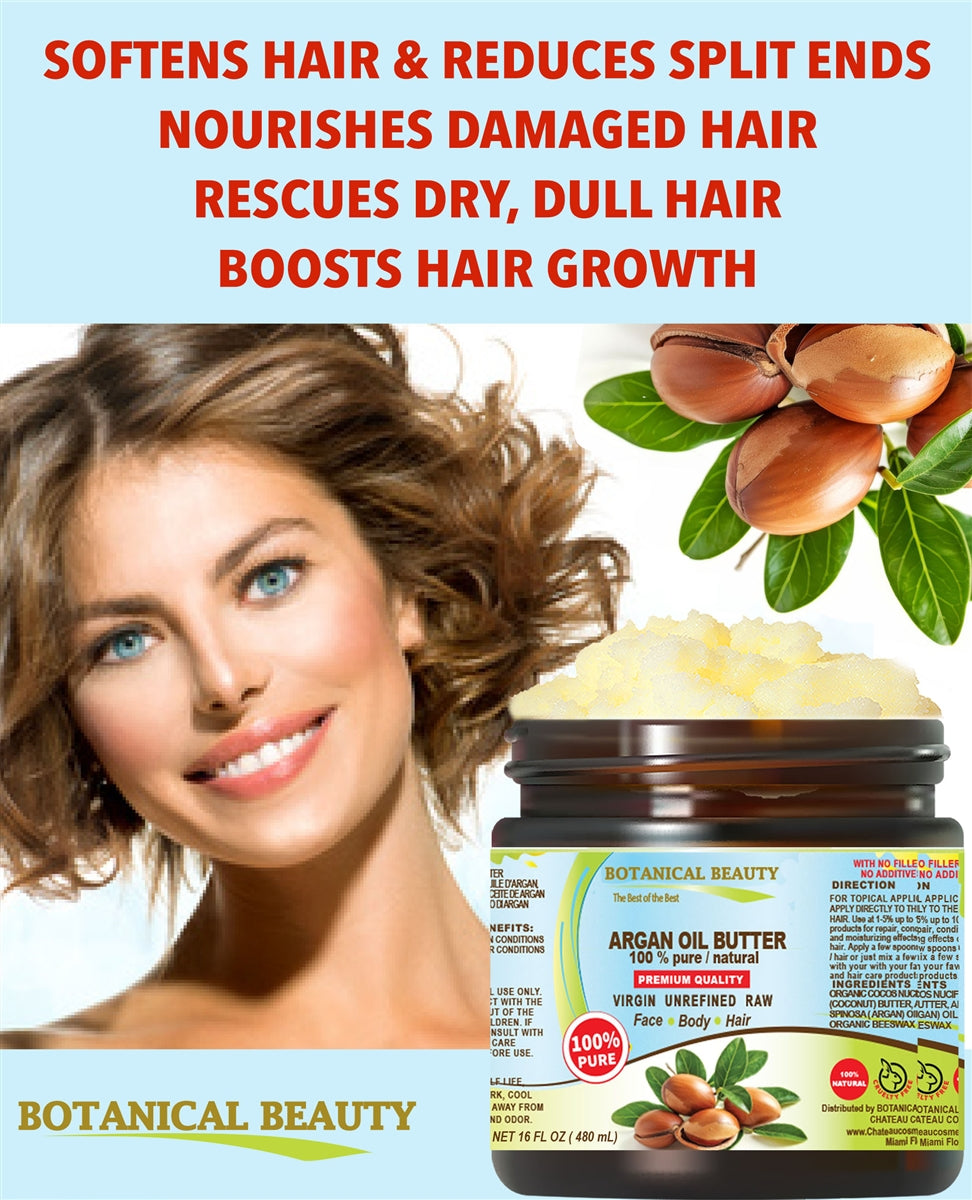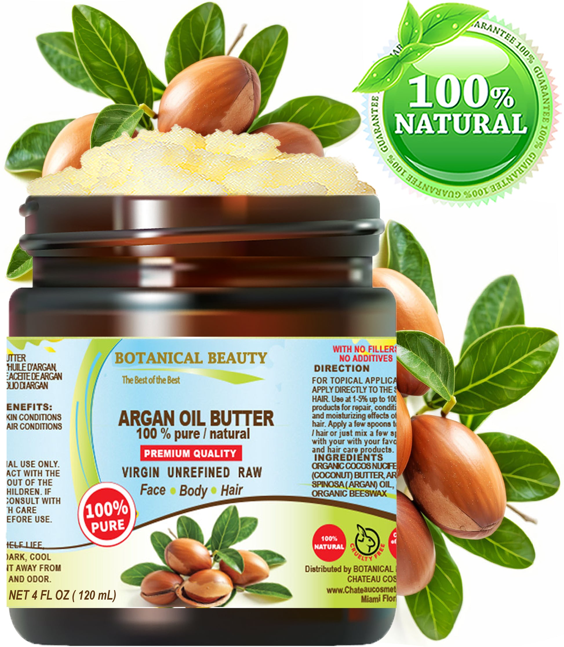 Manteca de aceite de argán Botanical Beauty 100 % pura, natural, de primera calidad, virgen sin refinar, cruda para rostro, cuerpo, cabello, labios y uñas.