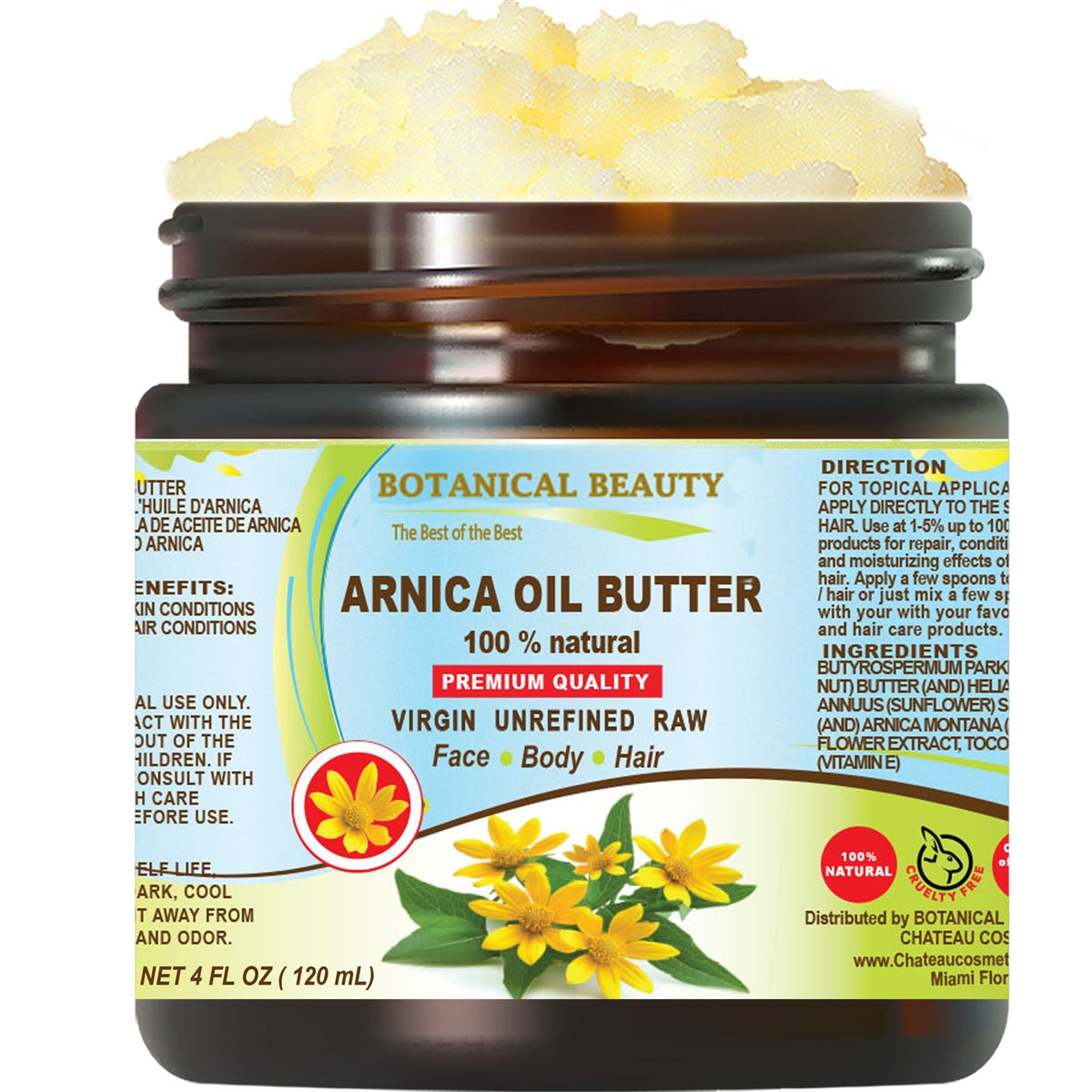 Manteca de aceite de árnica Botanical Beauty 100 % natural, de primera calidad, virgen sin refinar, cruda para rostro, cuerpo, cabello, labios y uñas.