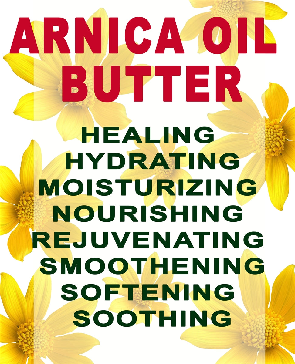 - Úselo tópicamente para CABELLO SECO, CABELLO DAÑADO, CUERO CABELLUDO SECO, CASPA y acondicione el cabello sin apelmazarlo. La manteca de aceite de árnica puede ser beneficiosa para mantener un cuero cabelludo saludable. Sus propiedades humectantes pueden ayudar a aliviar y calmar las condiciones del cuero cabelludo irritado o con picazón.