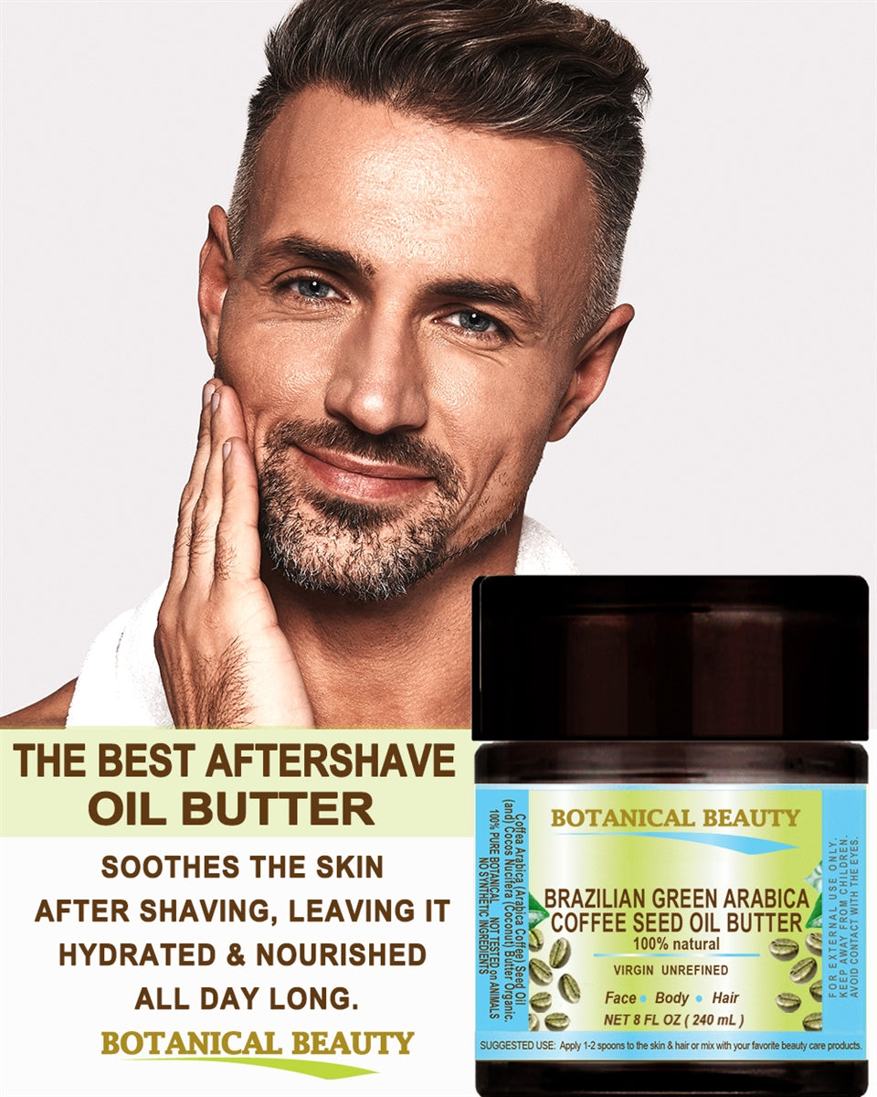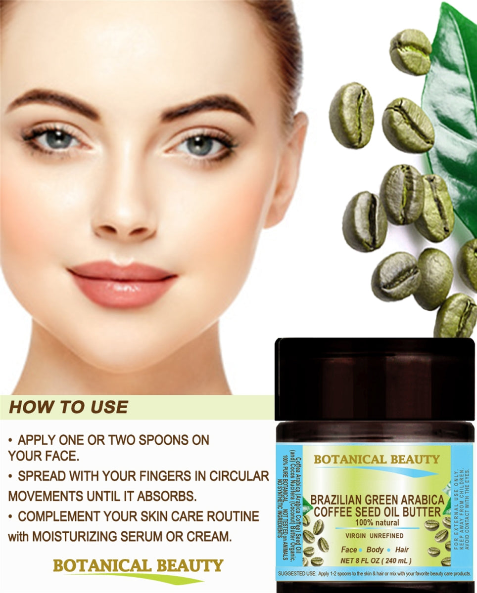La manteca de aceite de semilla de café arábigo verde brasileño se considera una de las mejores mantecas para reducir las arrugas, la hinchazón y las ojeras. Potente anticelulítico. Se puede utilizar para aliviar quemaduras, ampollas y cicatrices; piel seca, acné, psoriasis, eczema y arrugas, y se considera adecuada para todo tipo de piel, especialmente piel seca y madura envejecida. Botánico