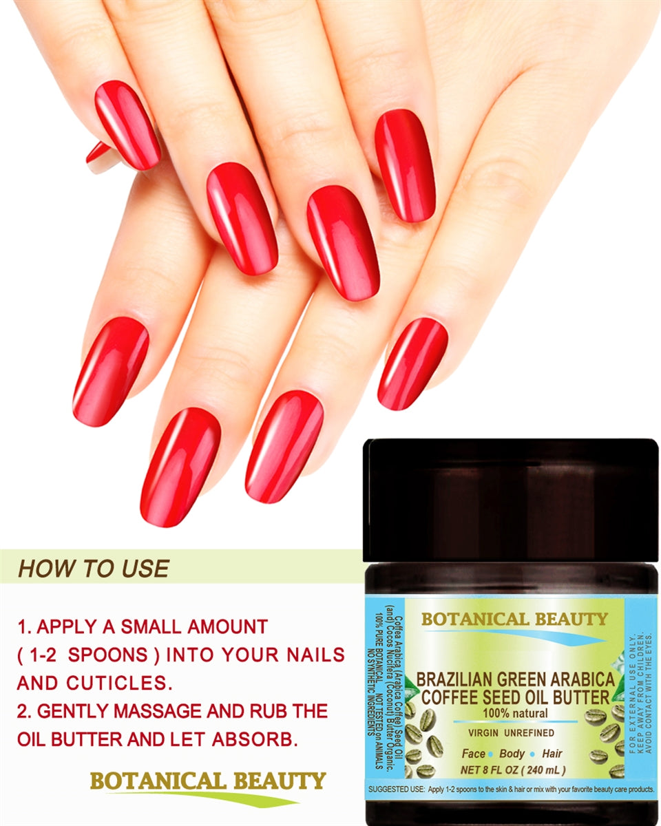 La manteca de aceite de semilla de café arábigo verde brasileño ayuda a mantener las uñas fuertes y saludables y mantiene las cutículas suaves y manejables.