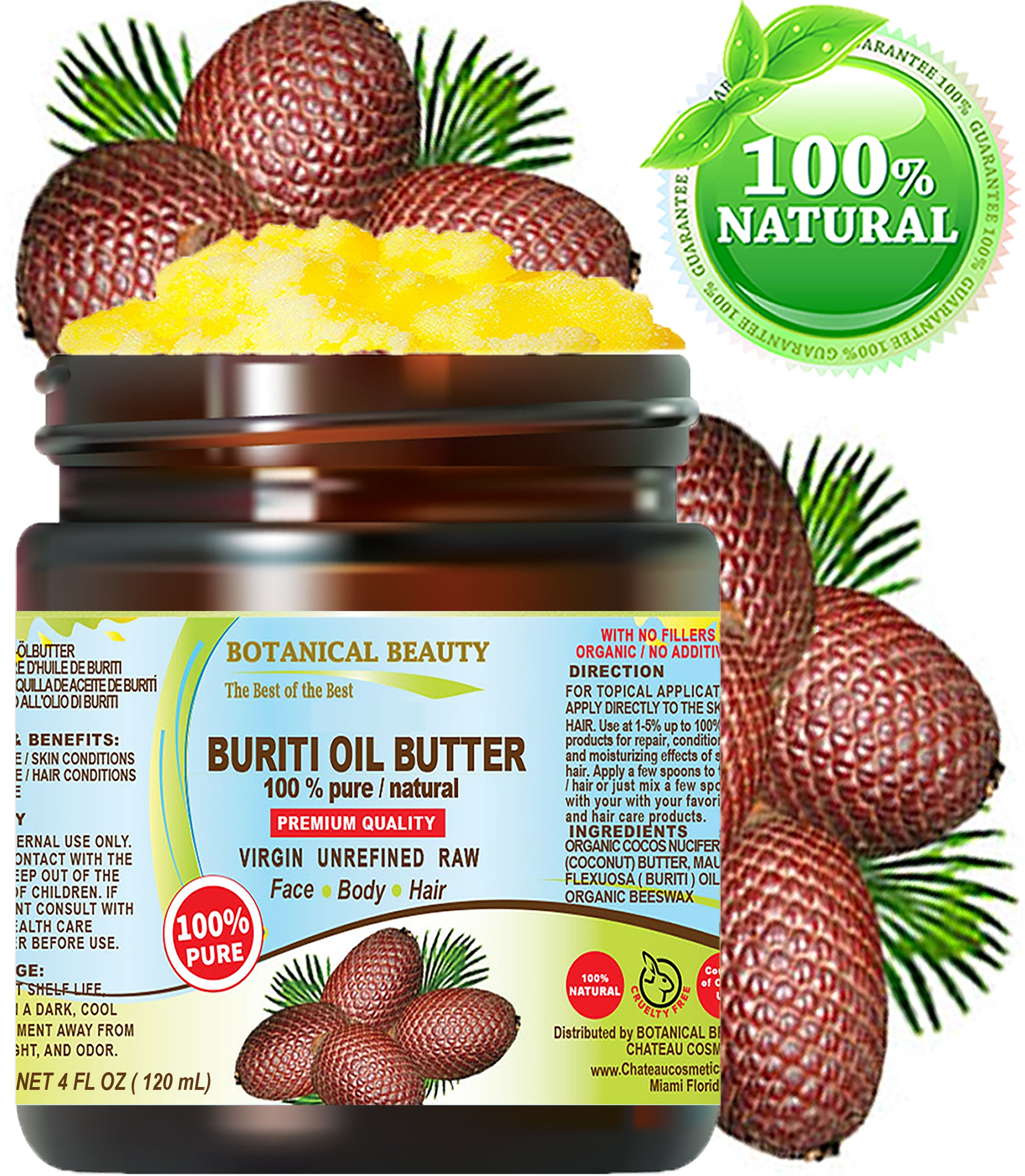 - La MANTECA DE ACEITE DE BURITI de Botanical Beauty es pura, sin refinar, prensada en frío, cruda y sin aditivos. Las FRUTAS DE BURITI son extremadamente ricas en vitamina E, vitamina C y tienen una de las fuentes naturales más ricas de provitamina A y betacaroteno con niveles superiores a los del aceite de semilla de zanahoria, contiene ácidos grasos omega 3, omega 6 y omega 9, como ácido gamma-linolénico (GLA) y vitamina B1, vitamina B2 y vitamina B6 del complejo B.