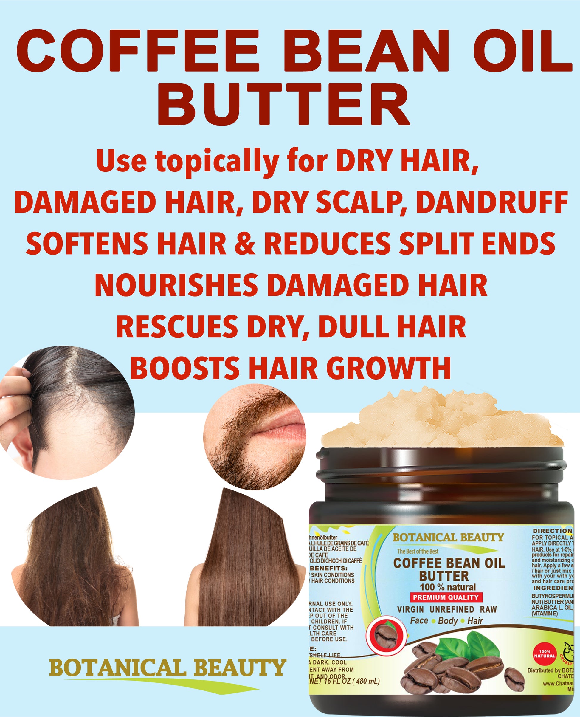 - El ACEITE Y MANTEQUILLA DE GRANO DE CAFÉ ARÁBICA es muy recomendado para el CABELLO SECO, QUEBRADIZO Y DAÑADO para estimular el crecimiento saludable del cabello, reparar las puntas abiertas y aumentar la vitalidad.