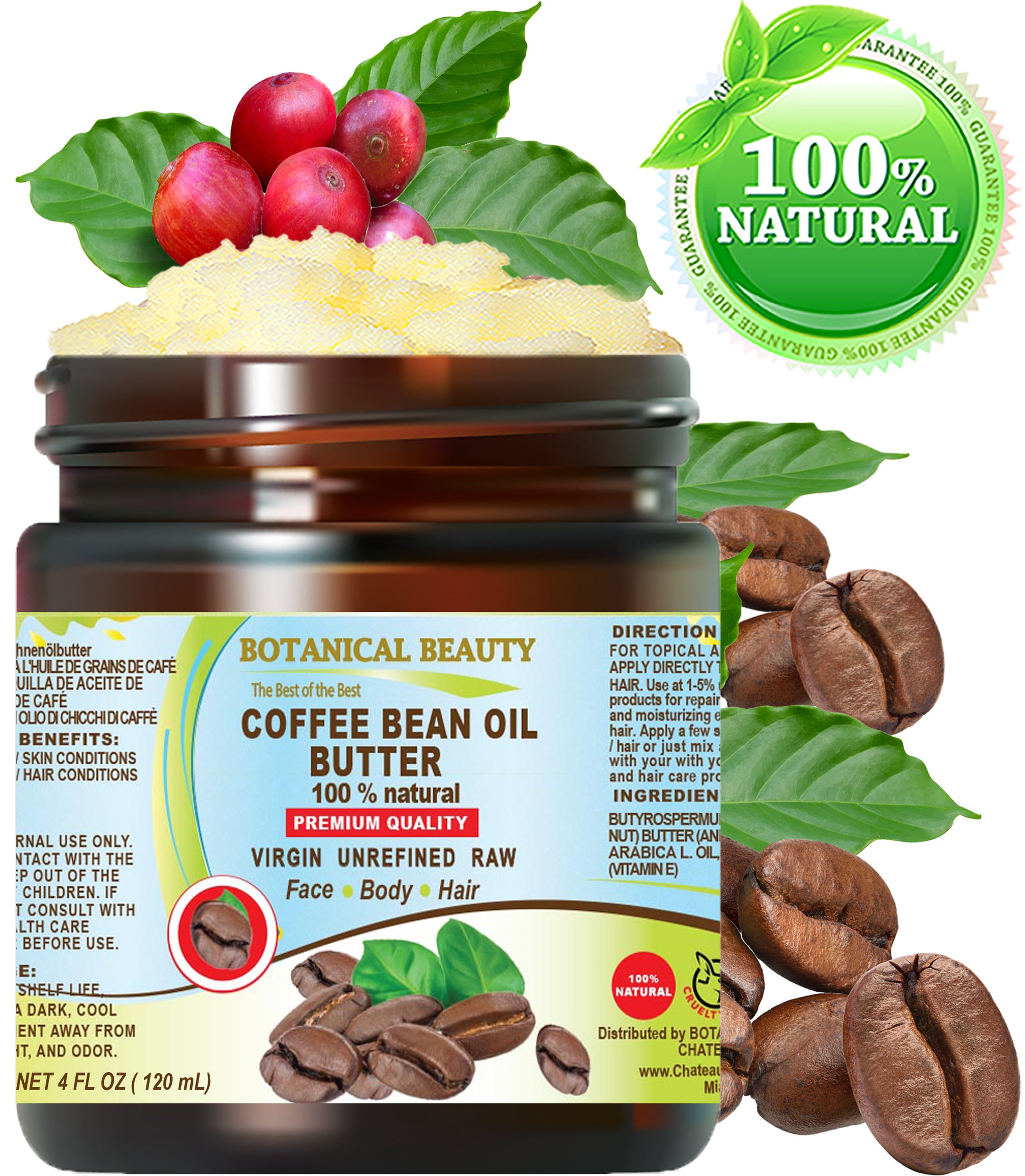 Mantequilla de aceite de café arábico Botanical Beauty brasileño 100 % natural, CRUDO SIN REFINAR, calidad superior con increíble aroma a café para el cuidado del rostro, el cuerpo, las manos, los pies, las uñas, el cabello y los LABIOS.