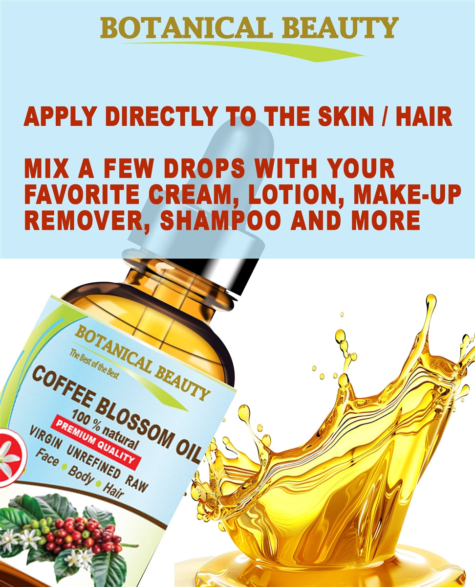 - El ACEITE DE FLOR DE CAFÉ de Botanical Beauty es aceite esencial de flor de café (Coffea Arabica L) en aceite de jojoba dorada (Simmondsia Chinensis) 100 % natural, prensado en frío, virgen y sin refinar. El aceite de flor de café de Botanical Beauty tiene el aroma celestial y ligero de las flores de la flor del café. También se conoce comúnmente como grano de café arábico, flor de café