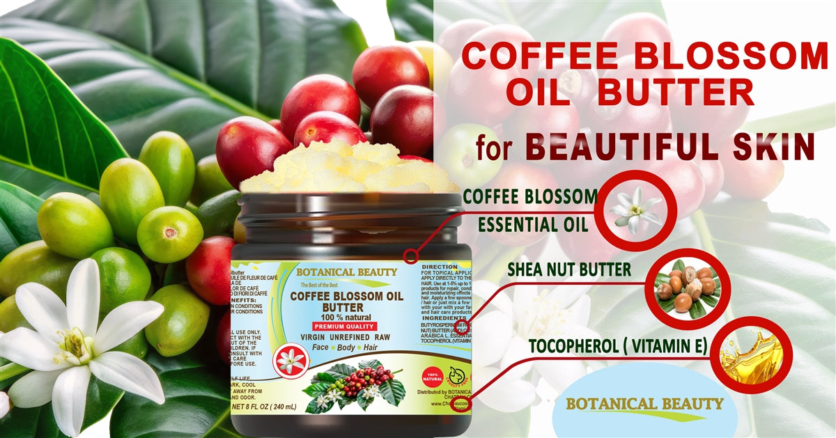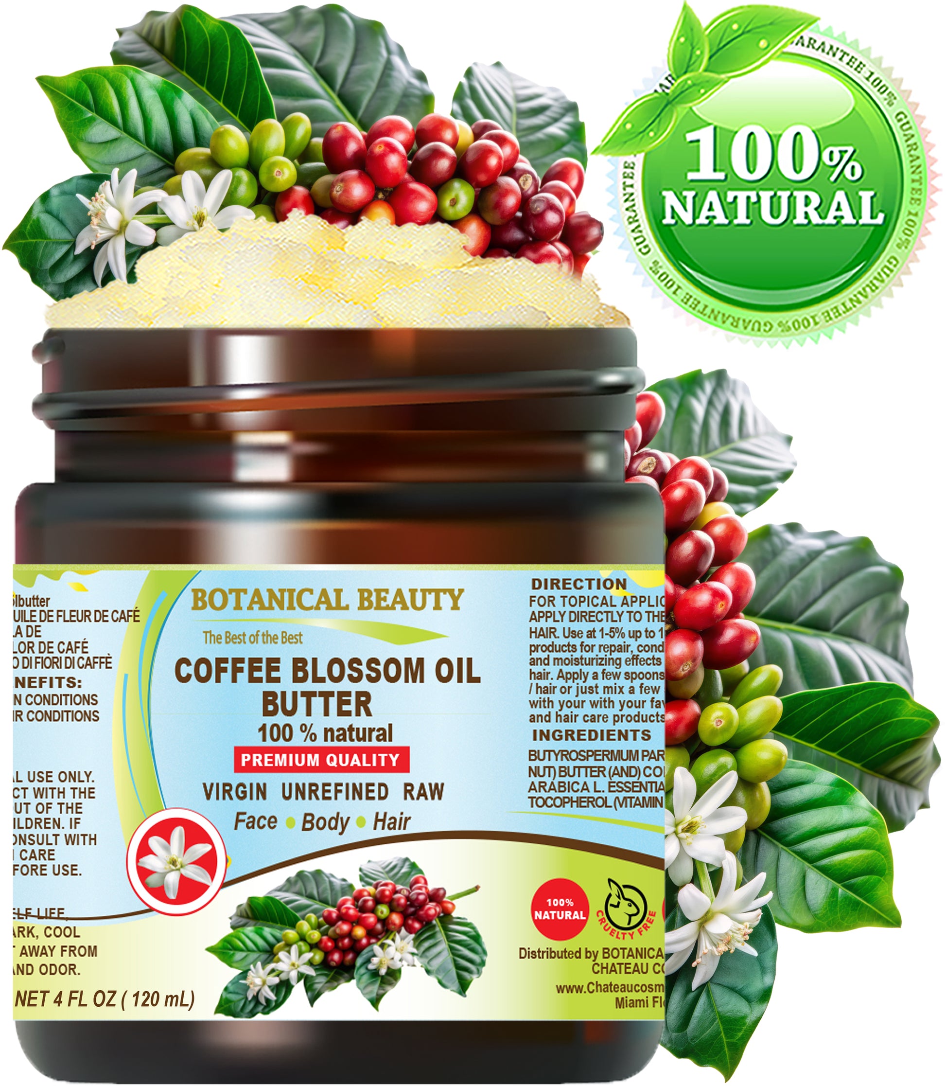MANTECA DE ACEITE DE FLOR DE CAFÉ de Botanical Beauty Aceite esencial de flor de café 100 % natural en manteca de karité para ROSTRO, PIEL, CUERPO, CABELLO Y UÑAS. Manteca de aceite humectante para la piel de Beauty, manteca de aceite nutritiva para la piel
