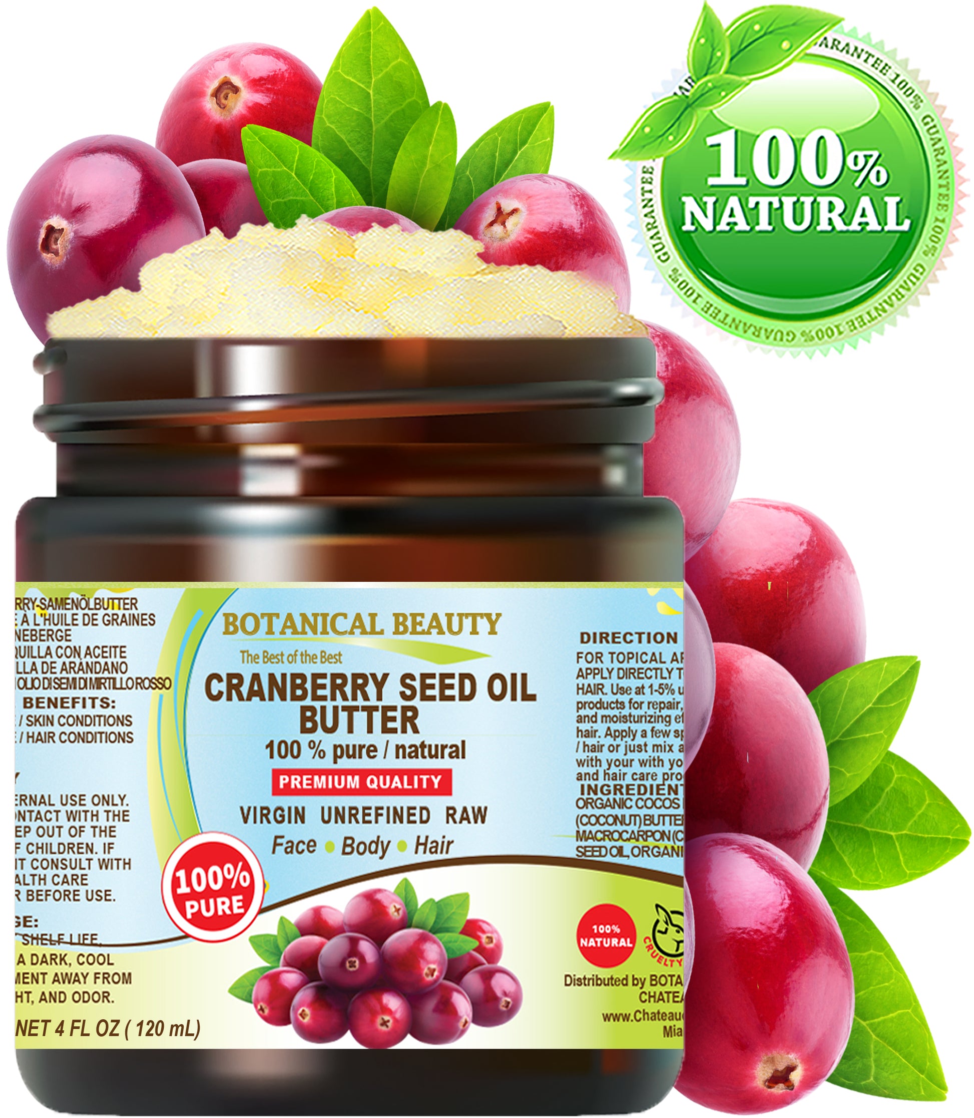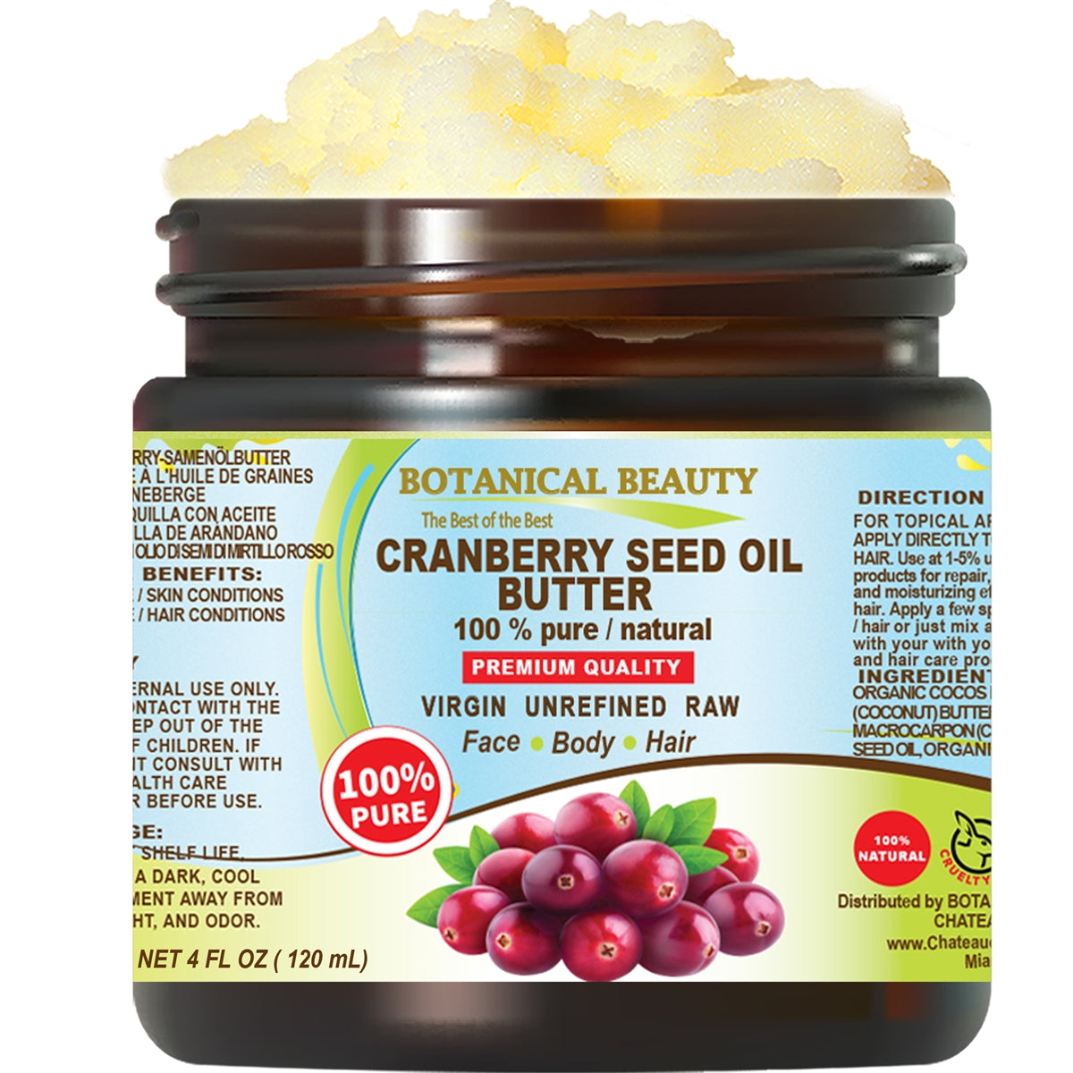 La MANTEQUILLA DE ACEITE DE SEMILLA DE ARÁNDANO es 100% botánica pura, no probada en animales y sin ingredientes sintéticos.