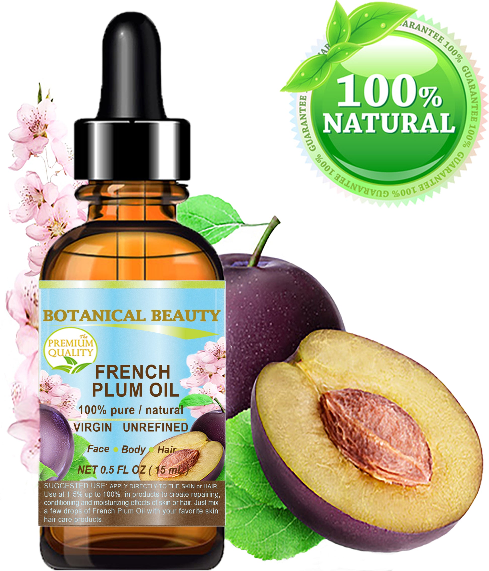 ACEITE DE CIRUELA Botanical Beauty Aceite portador prensado en frío 100% puro, natural, sin refinar, sin diluir, francés, para rostro, piel, labios, uñas, cabello y cuerpo.