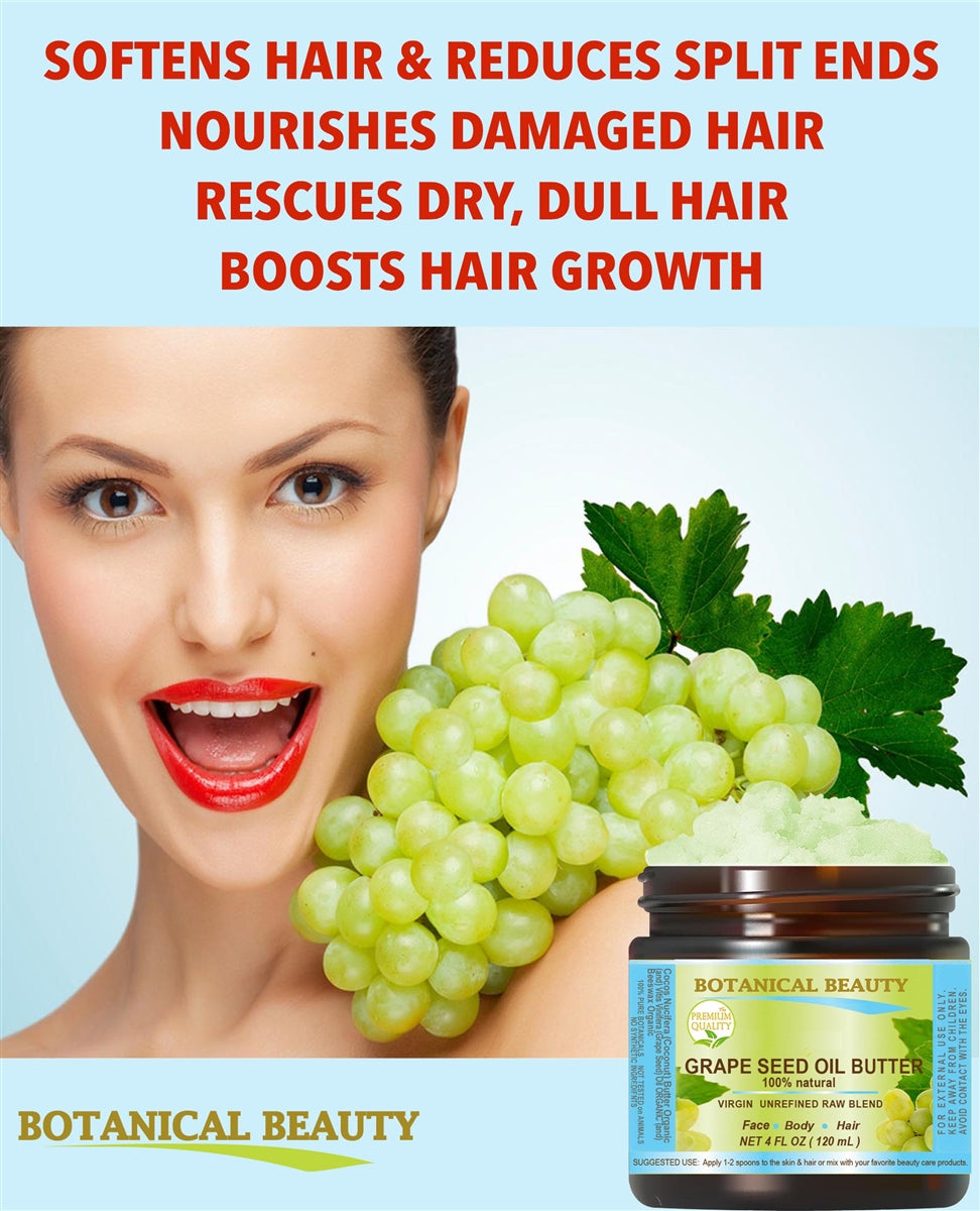 - LA MANTEQUILLA DE ACEITE DE SEMILLA DE UVA ayuda a curar la piel seca, agrietada y partida, equilibra la humedad de la piel y acondiciona bien el cabello.