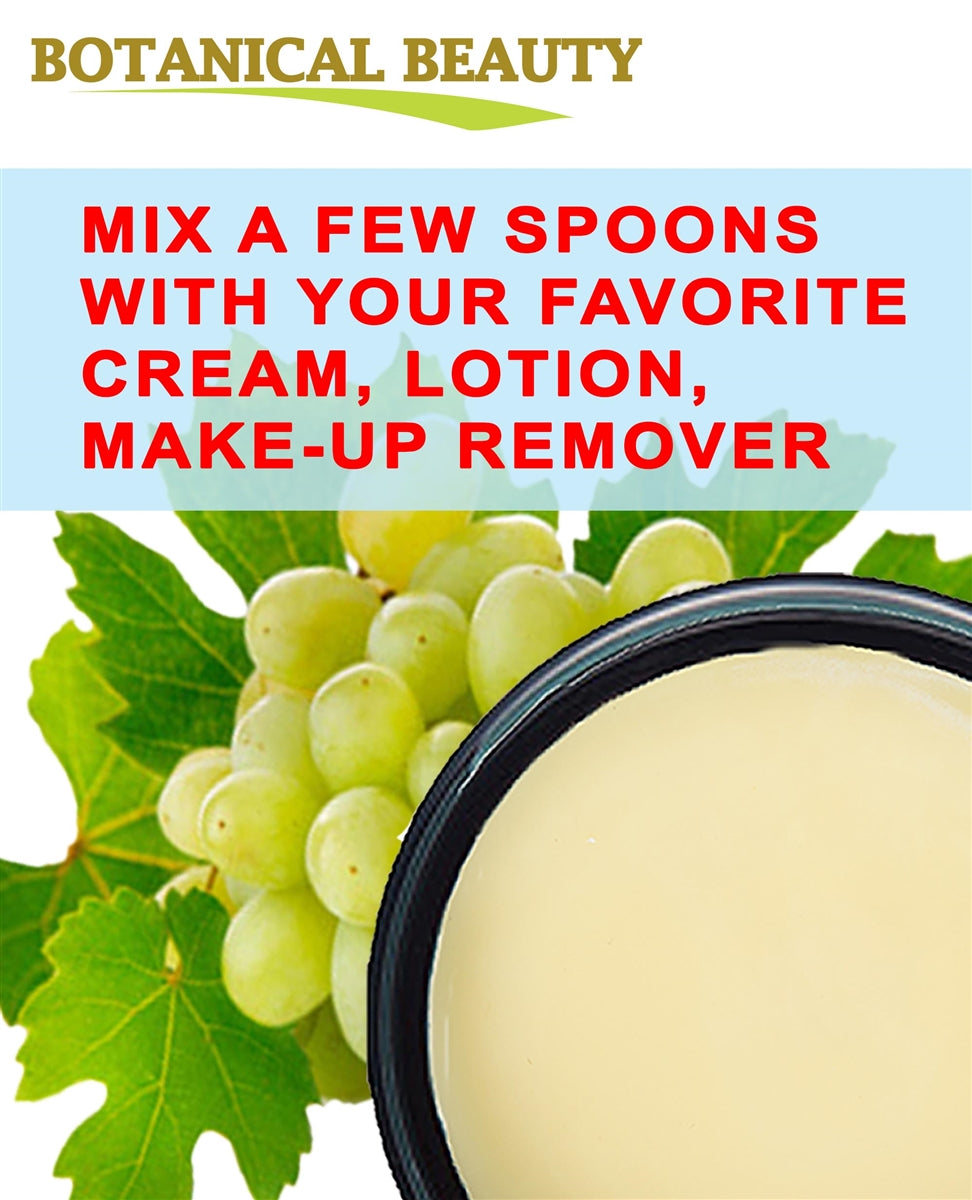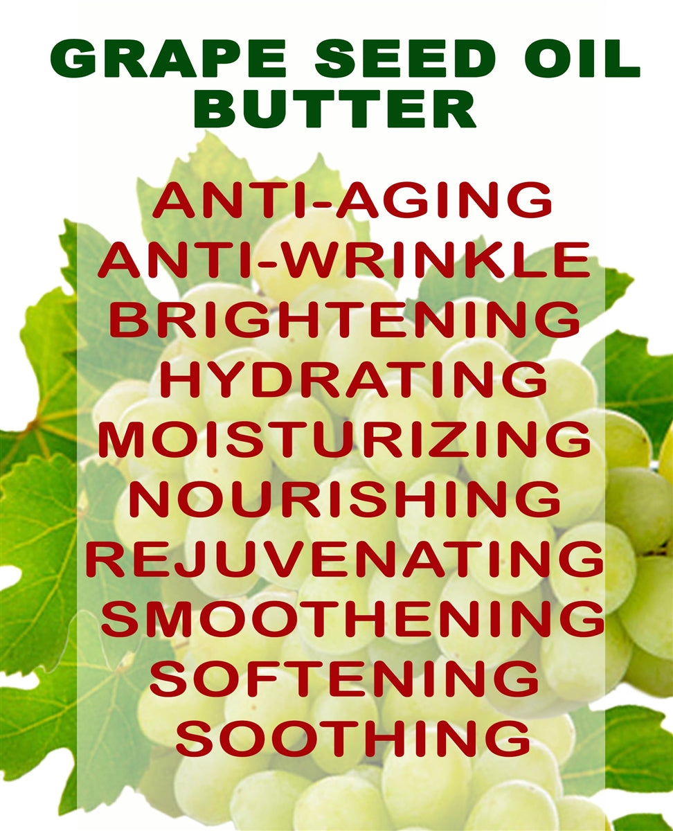 - La MANTECA DE ACEITE DE SEMILLA DE UVA cura, alivia e hidrata, lo que la convierte en una excelente opción para su régimen de cuidado de la piel, spa y aplicaciones aromaterapéuticas.