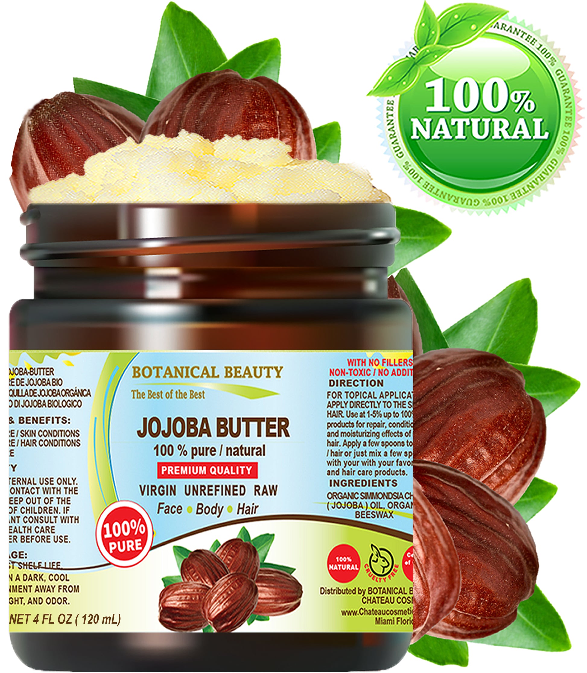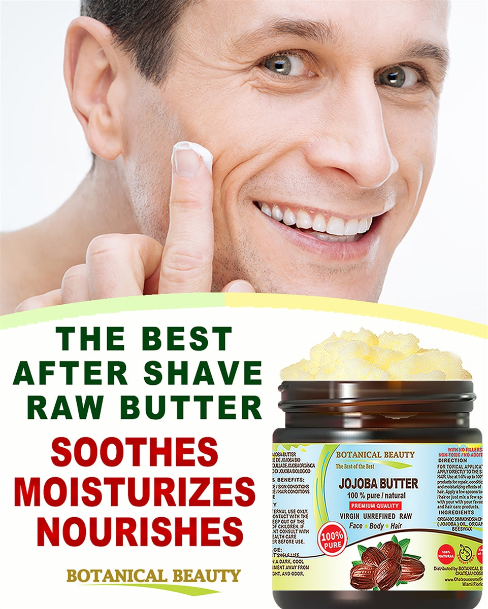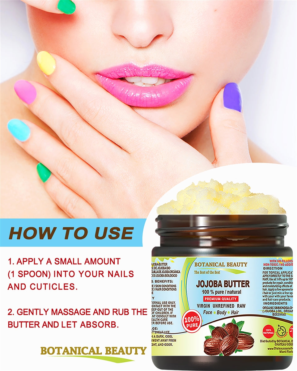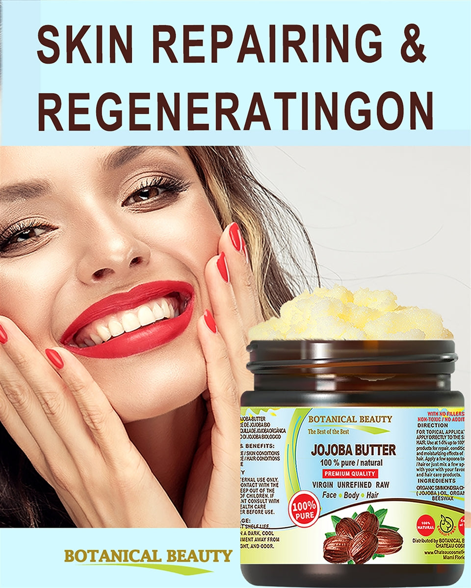 Manteca de jojoba Botanical Beauty 100 % pura, natural, de primera calidad, virgen, sin refinar, cruda para rostro, cuerpo, cabello, labios y uñas.