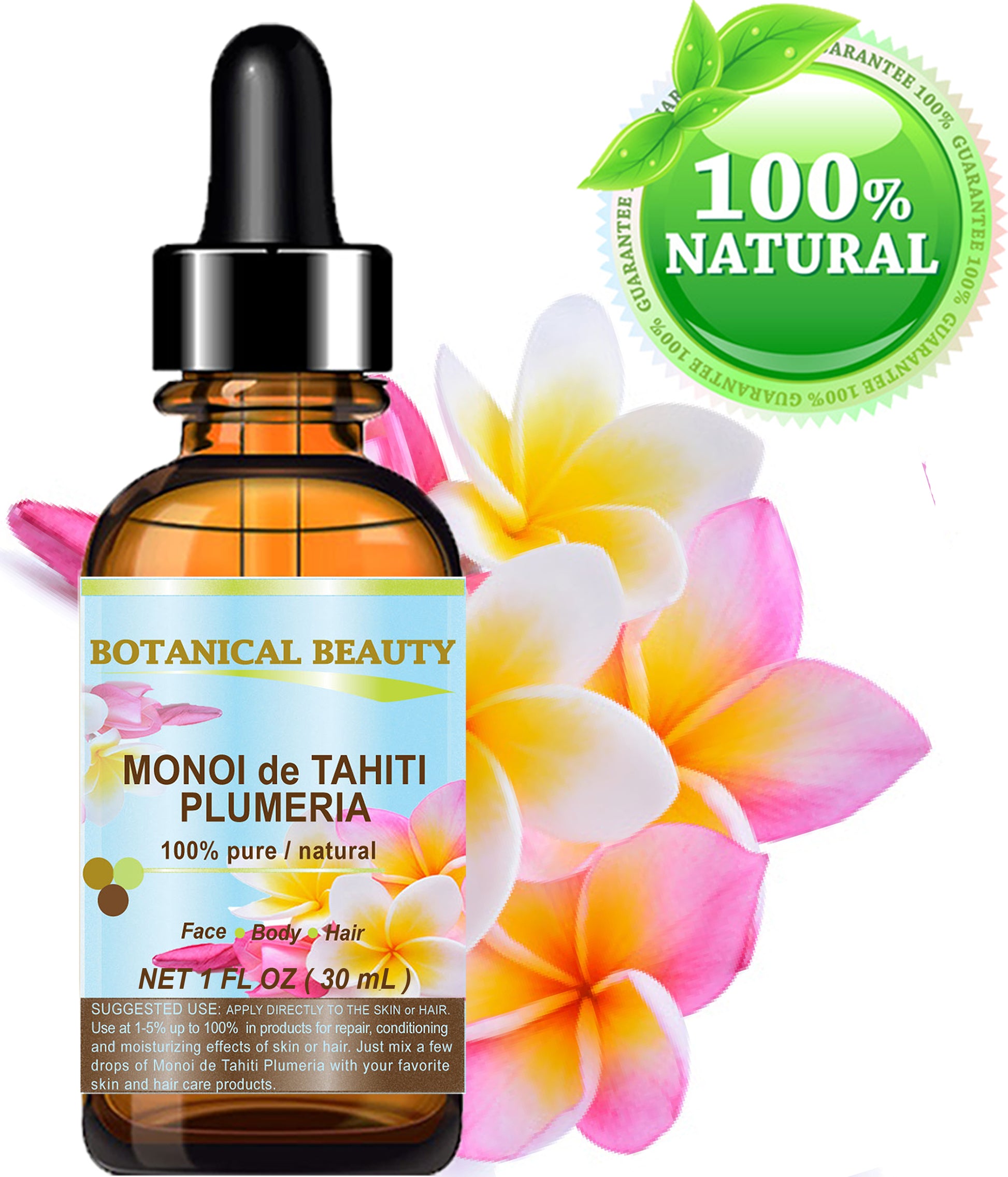 Aceite de Monoï de Tahití Botanical Beauty Plumeria 100% puro, 100% natural, garantía original de Polinesia para rostro, piel, cuerpo, cabello, labios y uñas.