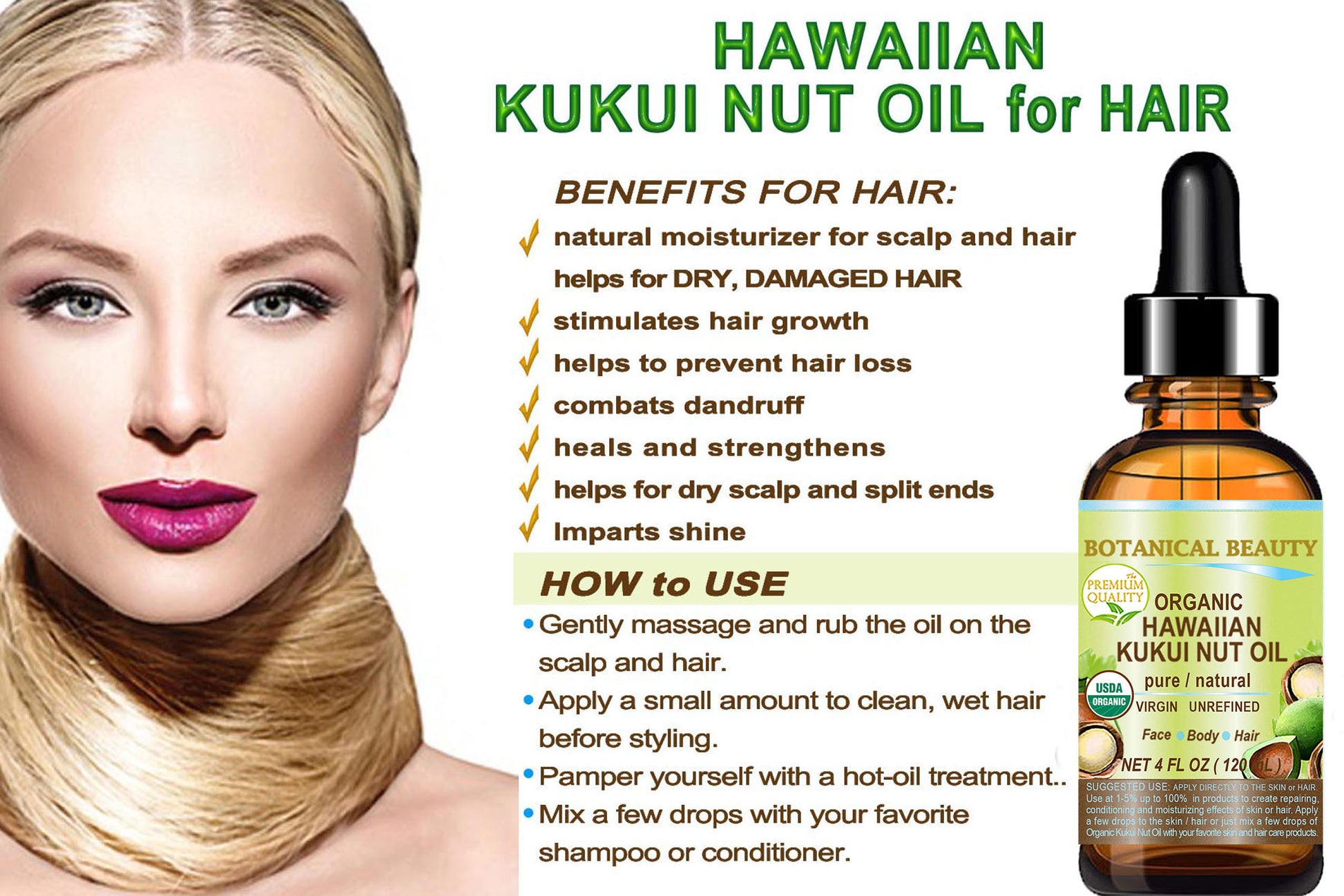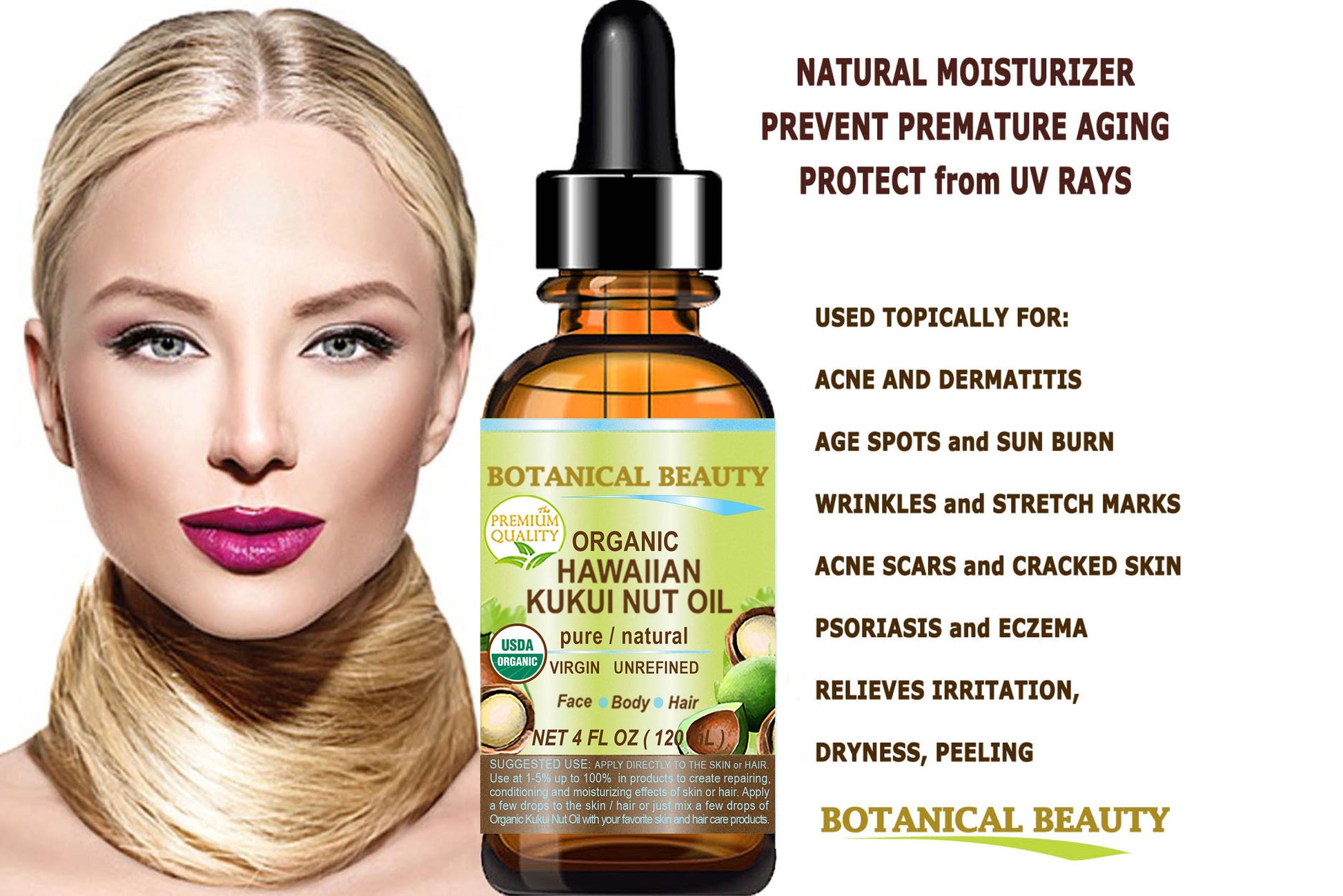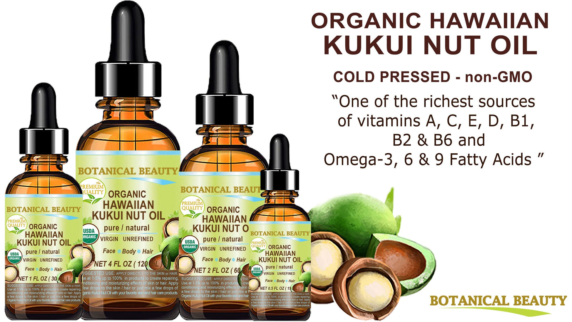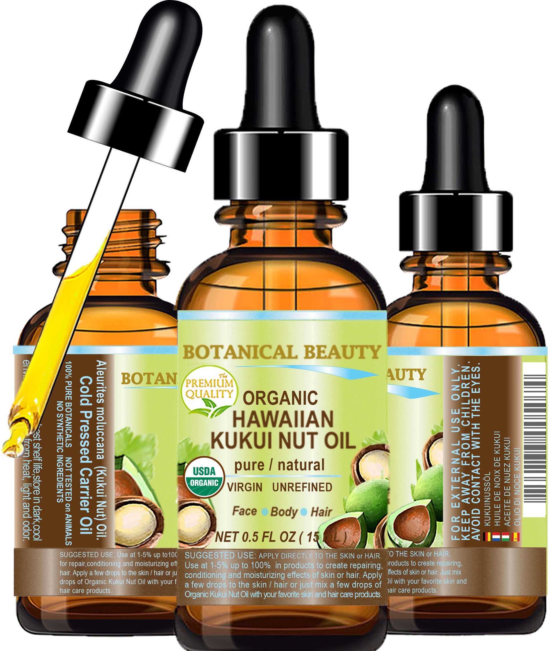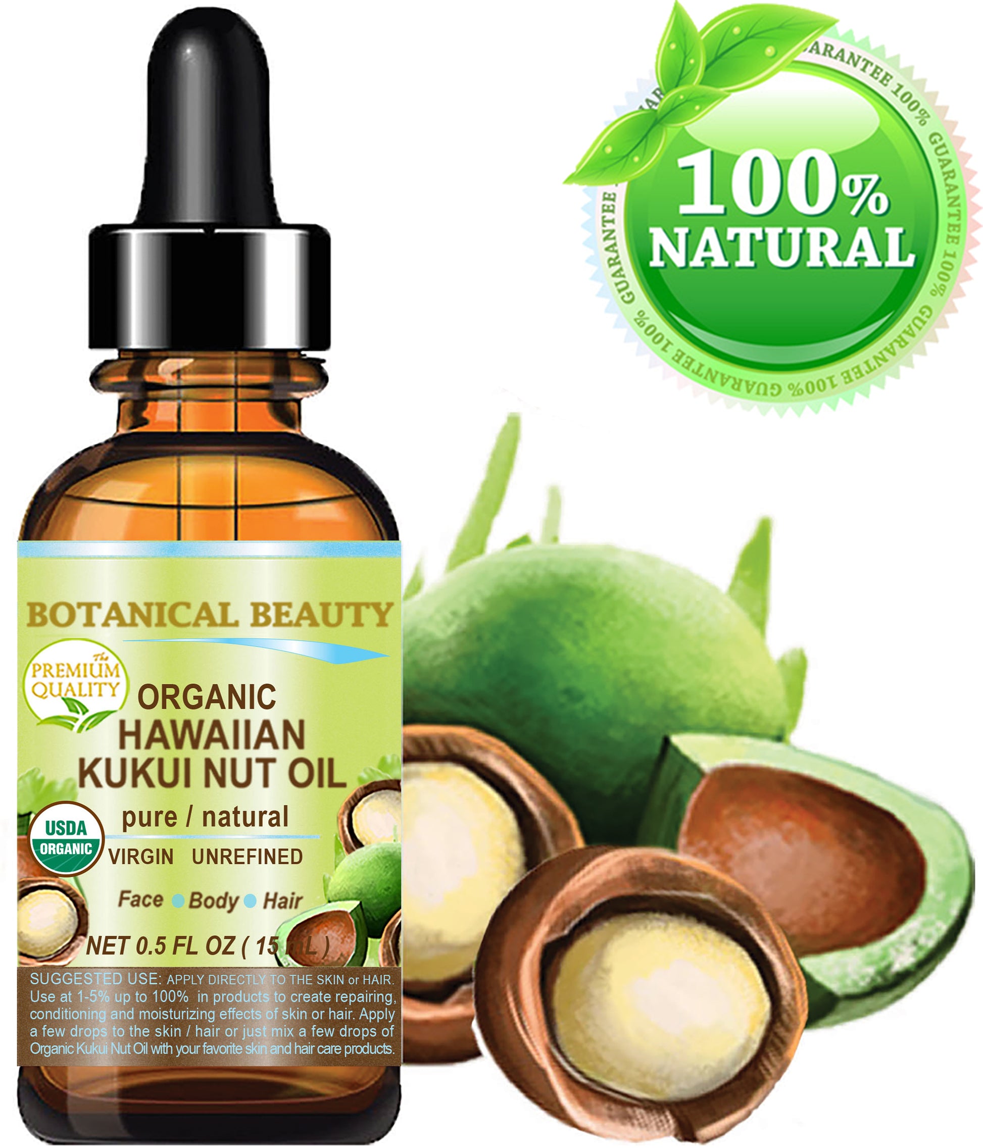 Aceite de nuez de kukui hawaiana orgánico certificado de Botanical Beauty, aceite portador puro virgen sin refinar prensado en frío para rostro, piel, cabello, uñas y cuerpo.