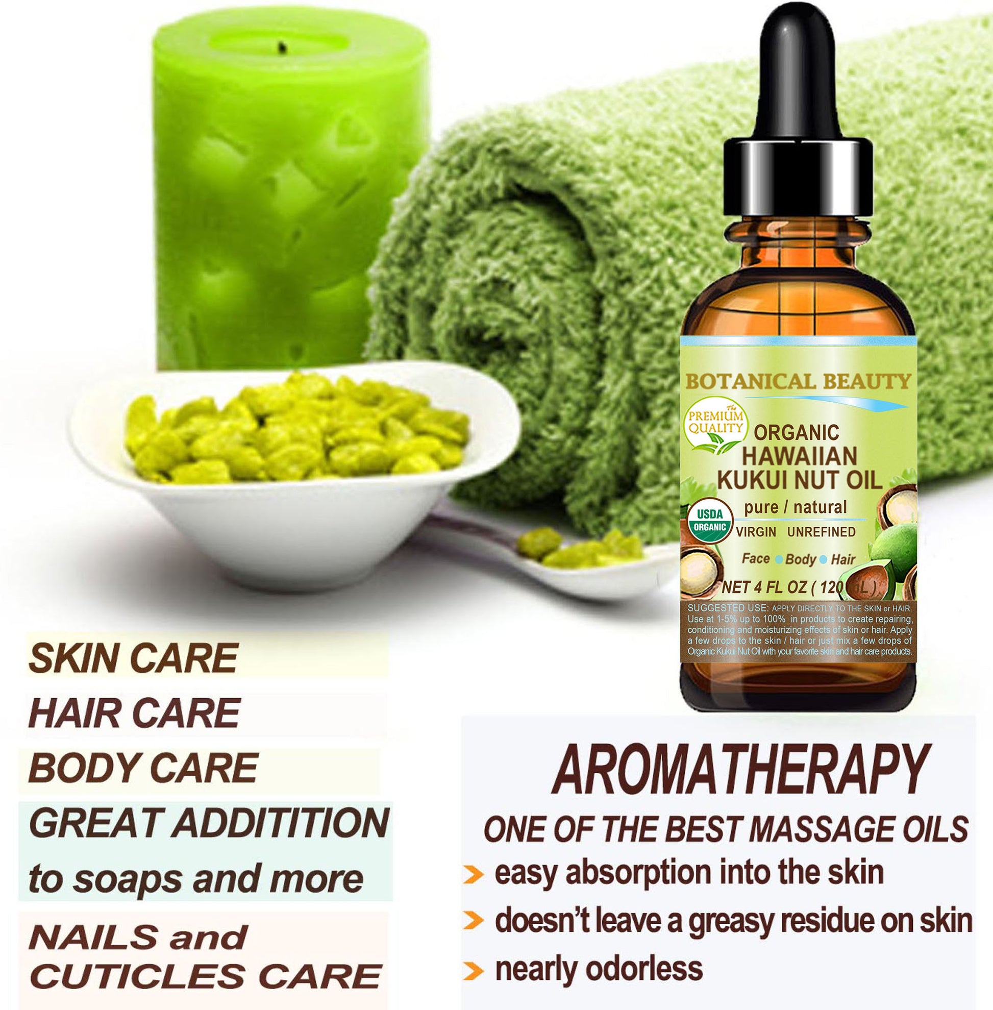 - El ACEITE ORGÁNICO DE NUEZ DE KUKUI HAWAIANO es muy beneficioso para DAR VOLUMEN Y REAFIRMAR LA PIEL. Adecuado para todo tipo de piel. Es un excelente aceite de aromaterapia, aceite de masaje o aceite para después del baño.