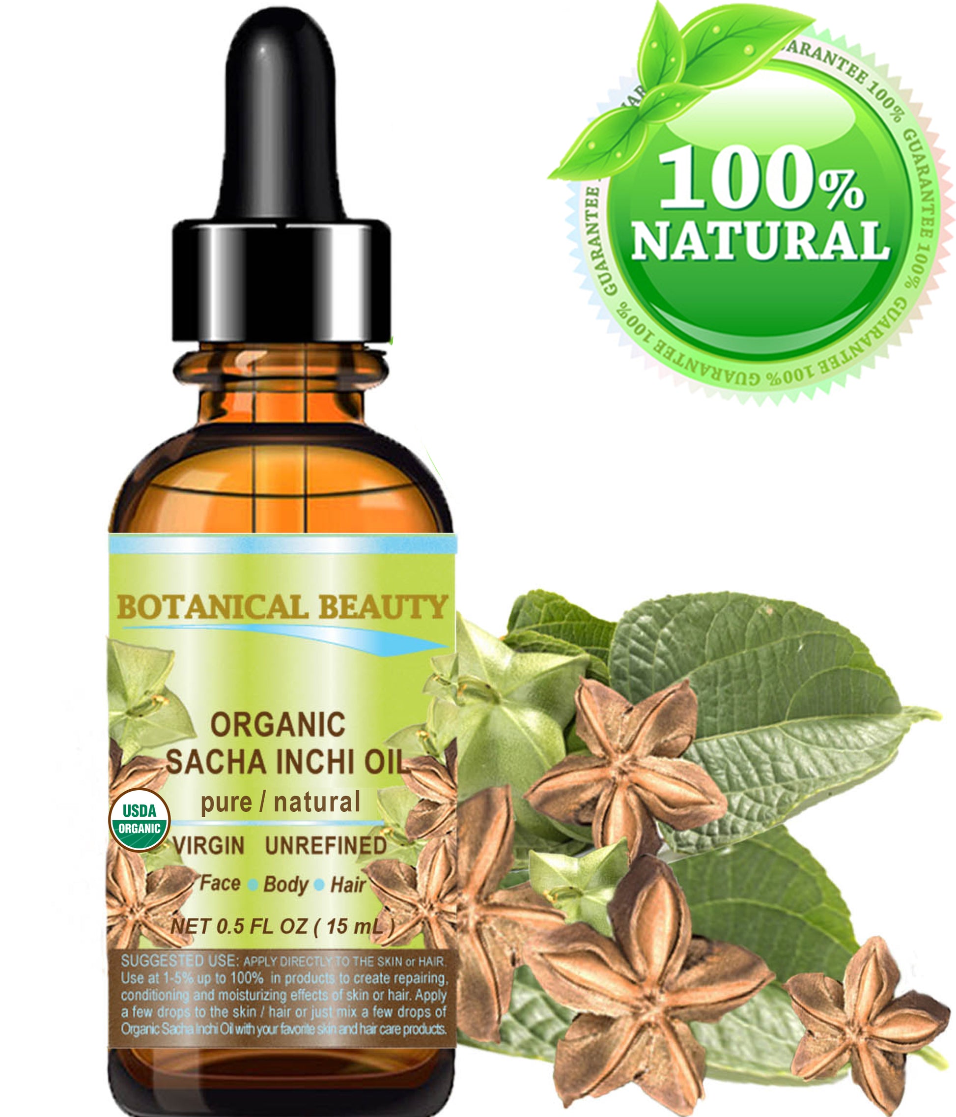 Aceite de Sacha Inchi orgánico certificado de Botanical Beauty, puro, natural, sin diluir, virgen y sin refinar para rostro, cuerpo, piel, cabello, labios y uñas.