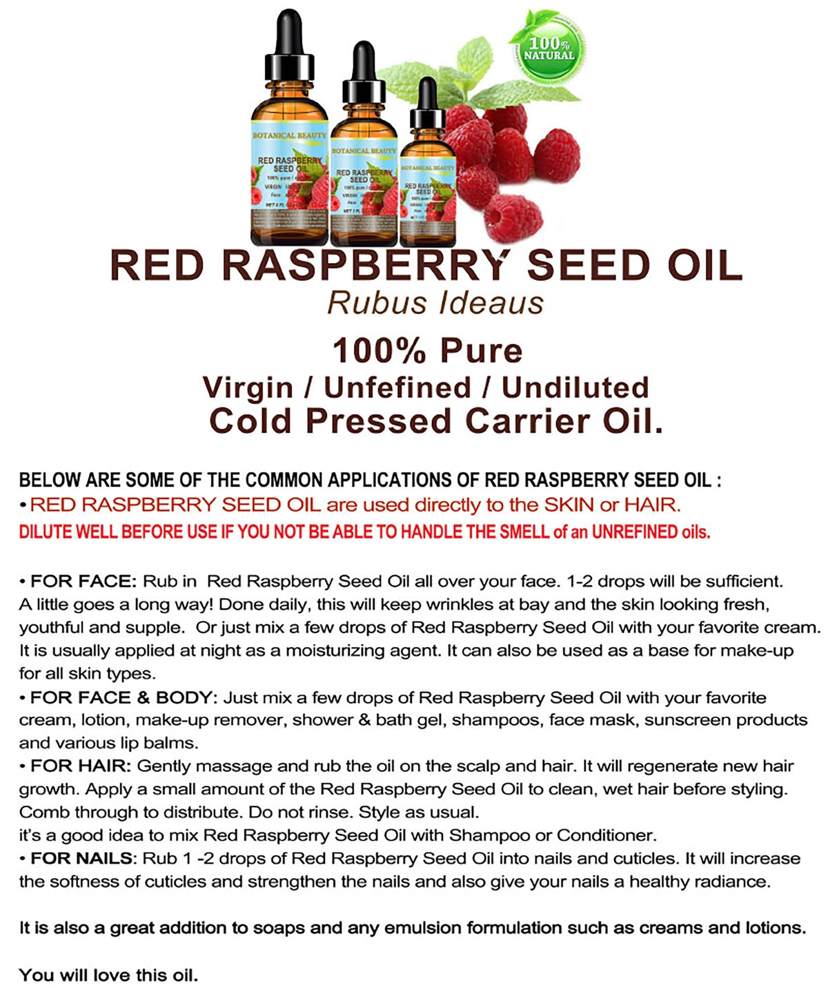 Aceite de semilla de frambuesa roja Botanical Beauty, aceite portador puro natural virgen prensado en frío sin diluir para rostro, piel, cabello, labios, cuerpo y uñas.