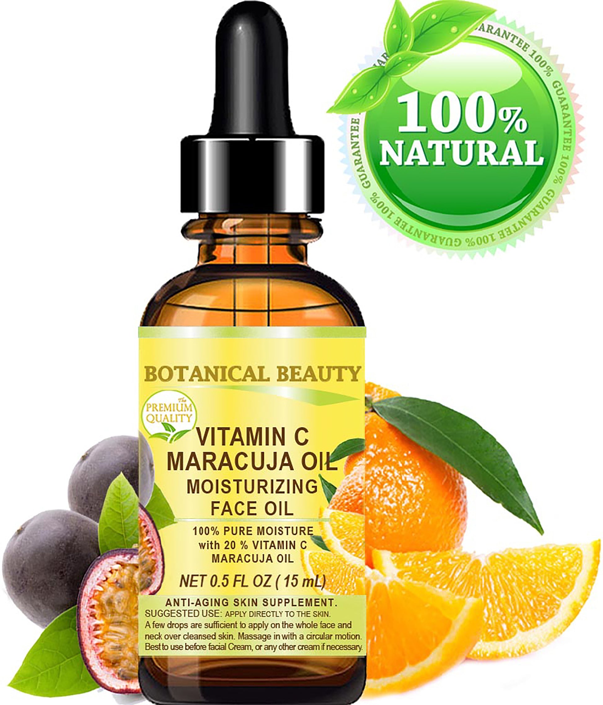 - El aceite facial de maracuyá con vitamina C al 20 % es uno de los mejores humectantes antienvejecimiento. No exfolia ni irrita la piel. No contiene conservantes. 100 % de garantía de satisfacción de Botanical Beauty.