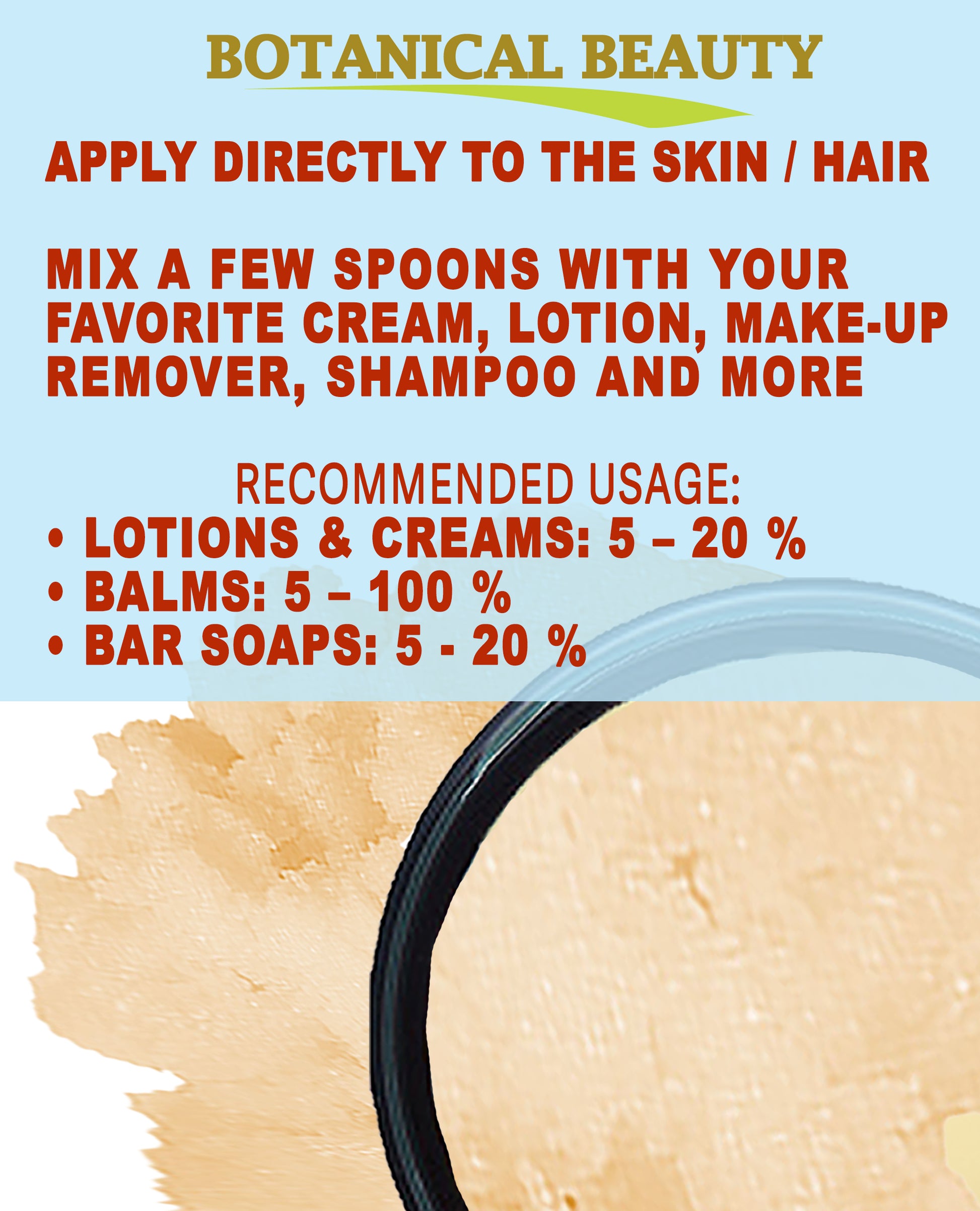 It is also a great addition to soaps, Lotions & Creams & Hair products: 5 - 20% Balms: 5 - 100% Bar Soaps: 5 - 20%.