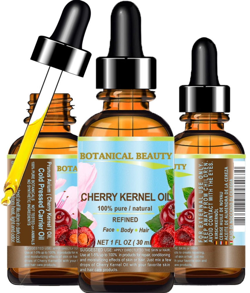 Botanical Beauty Cherry Kernel Oil 100% Pure Natural Refined Undiluted Cold Pressed Carrier Oil for Face, Body, Feet, Hair, Massage, and Nail Care.