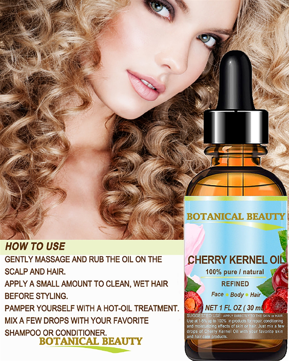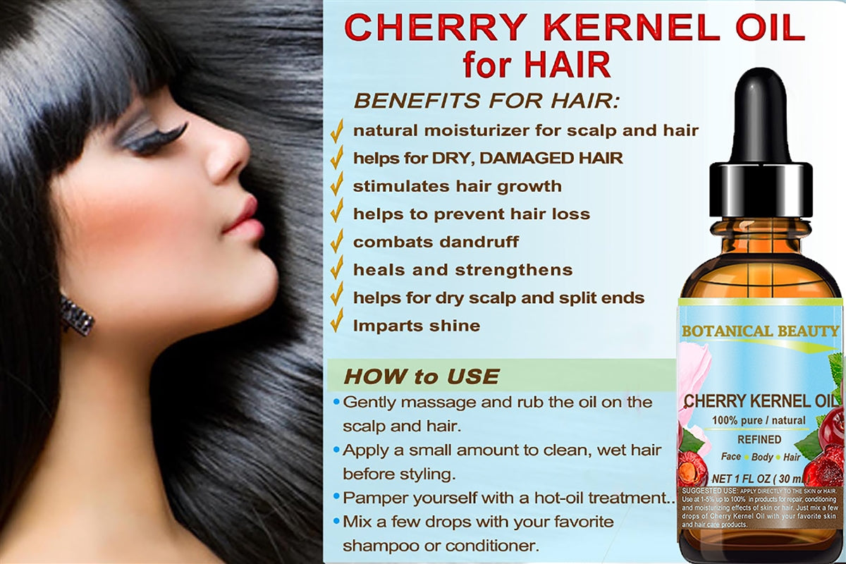 - CHERRY KERNEL OIL helps for DRY, DAMAGED HAIR, DRY SCALP, AND BRITTLE NAILS. LIP CARE. CHERRY KERNEL OIL is one of the lightest oils available. It is a highly penetrating emollient oil, that absorbs easily into the skin, so it makes a GOOD MASSAGE oil.