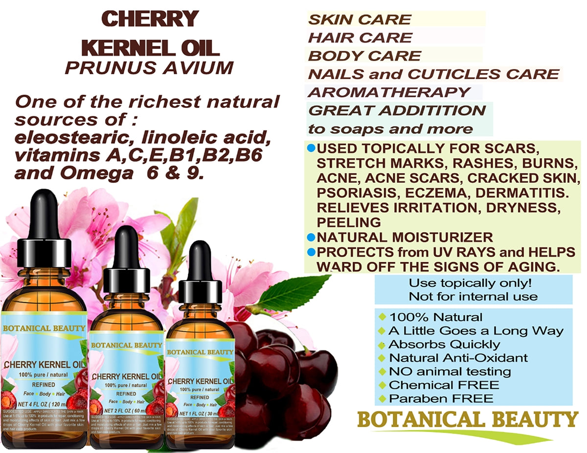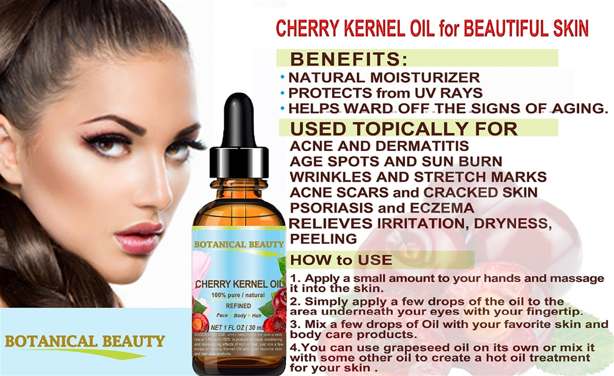 - CHERRY KERNEL OIL helps damaged skin like ACNE, PSORIASIS, ECZEMA, DERMATITIS, SUNBURN, STRETCH MARKS, BURNS, CUTS, SCARS, ACNE, AND CELLULITE.