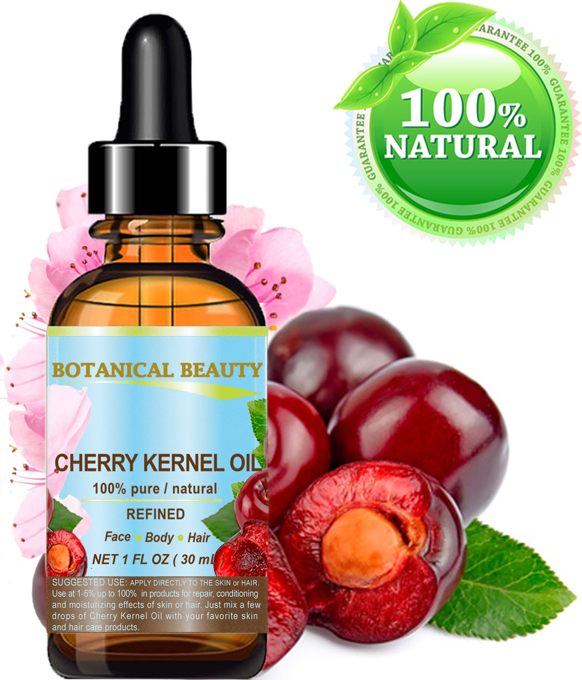 Cherry Kernel Oil helps to heal dry, chapped, and cracked skin, balances the moisture in the skin, softens fine lines and wrinkles, and restores skin's own elasticity and tone. It is widely used on skin with acne and cellulite.