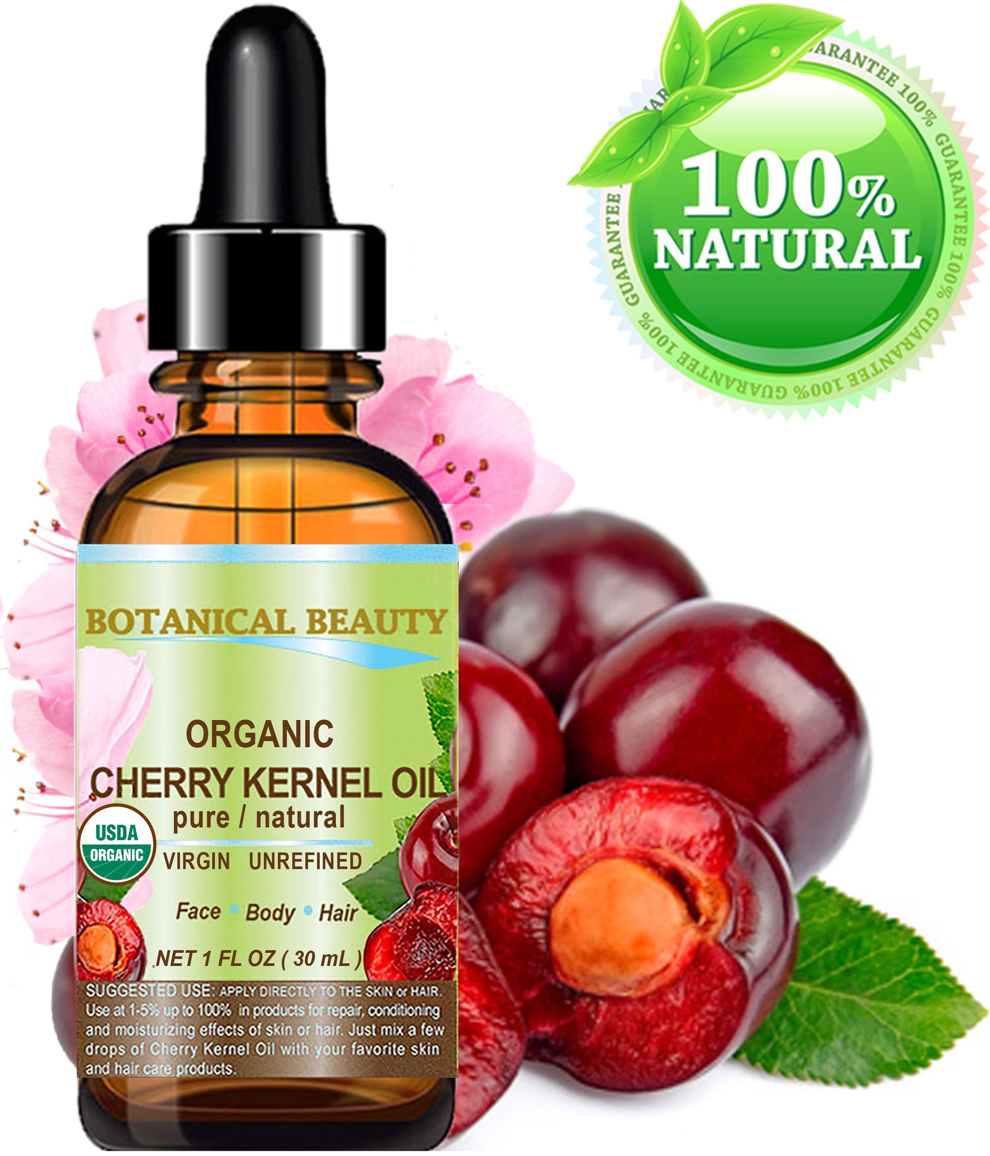 - ORGANIC CHERRY KERNEL OIL helps damaged skin like ACNE, PSORIASIS, ECZEMA, DERMATITIS, SUNBURN, STRETCH MARKS, BURNS, CUTS, SCARS, ACNE, AND CELLULITE.