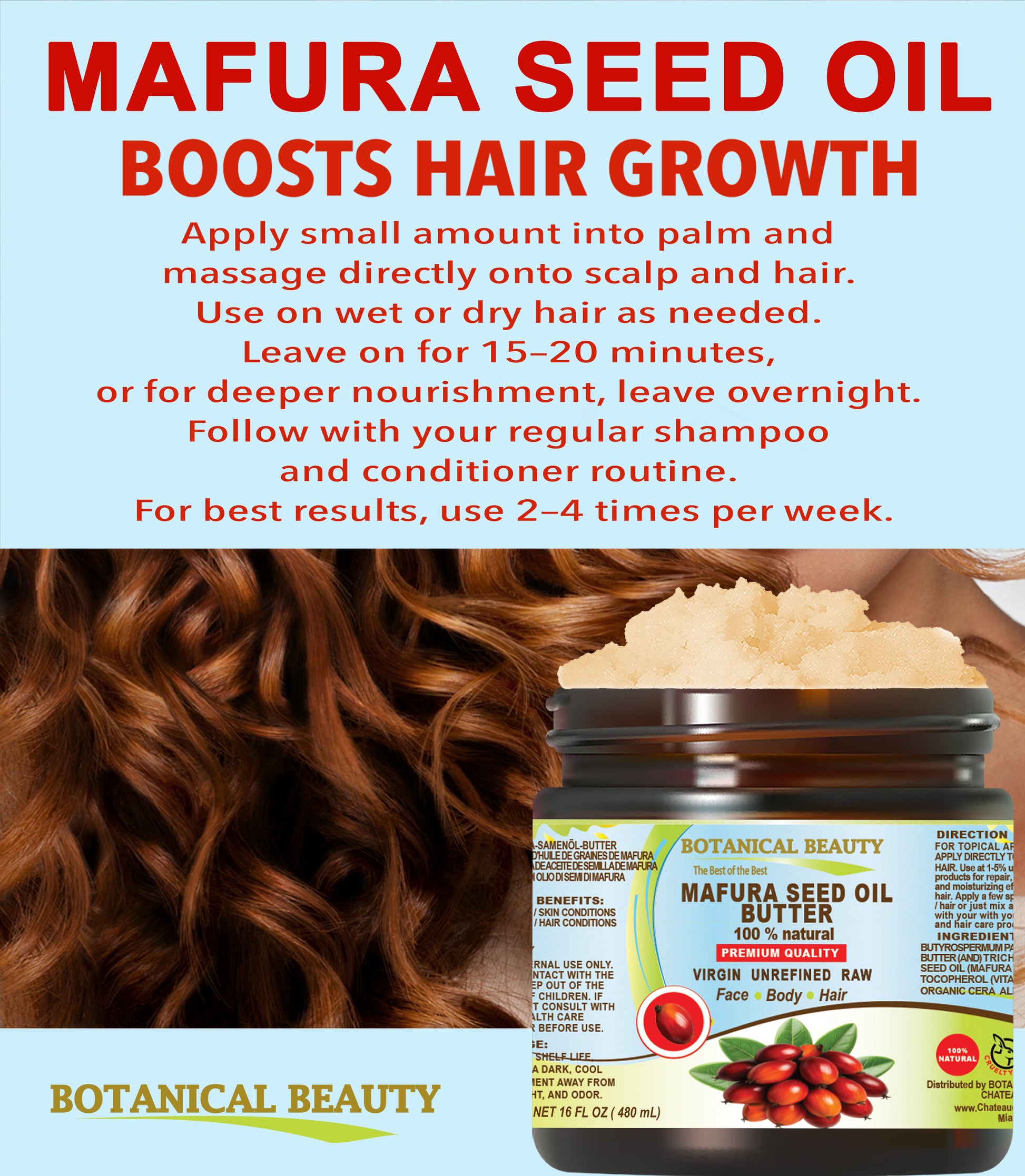 - Use topically for DRY HAIR, DAMAGED HAIR and DRY SCALP, DANDRUFF, HAIR GROW and condition hair without weighing it down. Used in haircare, the nourishing and conditioning qualities of Mafura Oil are known to encourage stronger, longer, and healthier hair growth, address hair loss, hydrate the strands, bring out hair's natural sheen, and help with easier manageability.